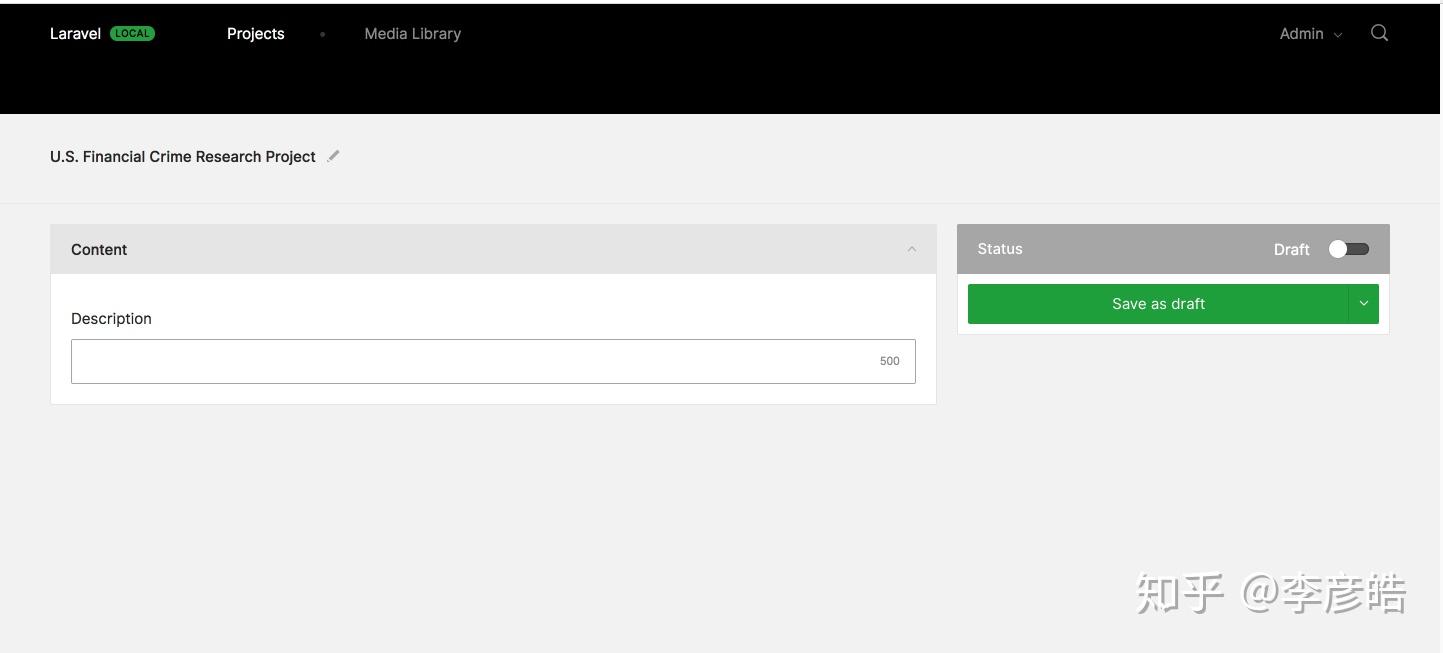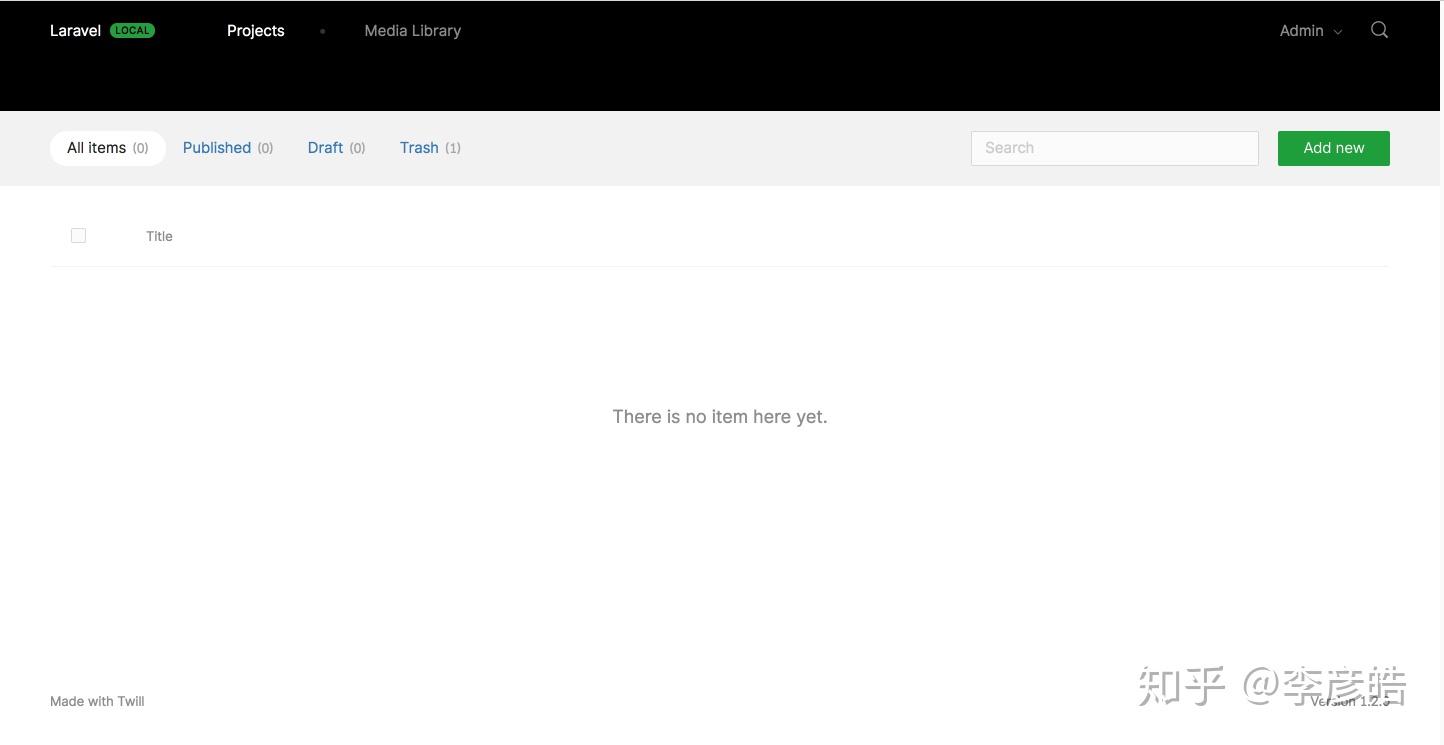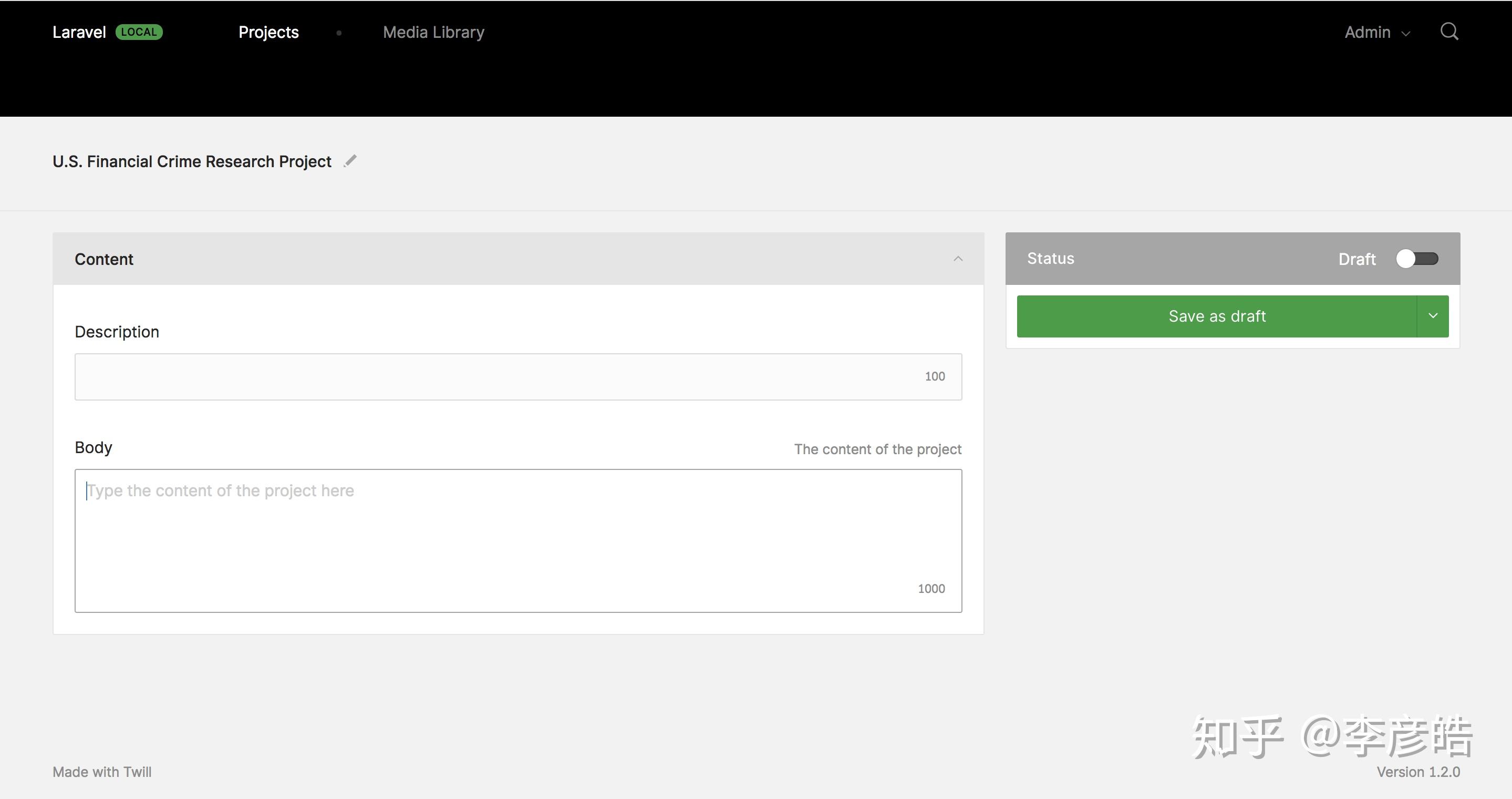 至此一个新的CRUD模块 Projects 就添加完成啦,你可以在Twill里自由创建📦,编辑✏️,删除🗑来管理 Projects,Twill还有丰富的其他管理功能等你去发现 ~